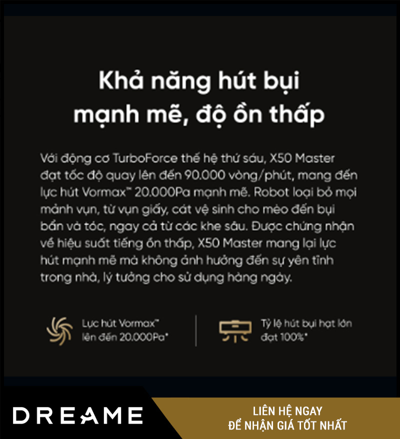 Một robot hút bụi chỉ thật sự mạnh mẽ khi có động cơ đủ lực hút để “xử lý sạch chỉ trong một lượt quét”. Dreame X50 Master được trang bị TurboForce™ – thế hệ động cơ mới nhất, kết hợp với công nghệ Vormax™, mang lại lực hút lên tới 20.000Pa – nằm trong top đầu của các robot hút bụi năm 2025.