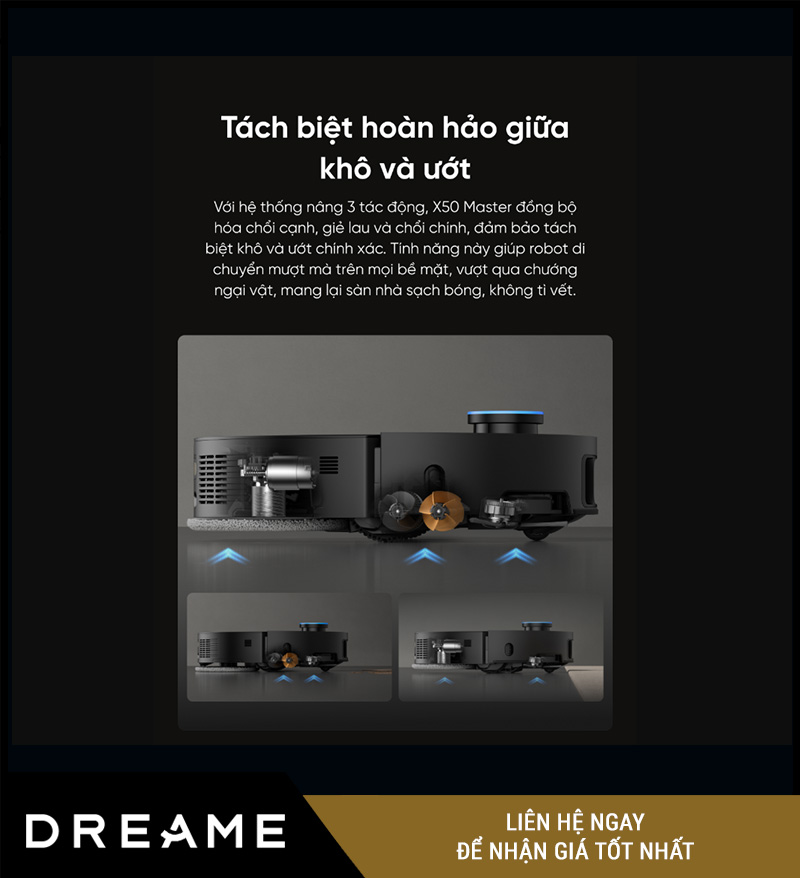 Không giống như những dòng robot chỉ “vừa hút vừa kéo giẻ lau” dễ gây loang bẩn, Dreame X50 Master được nâng cấp với hệ thống làm sạch khô – ướt tách biệt rõ ràng: