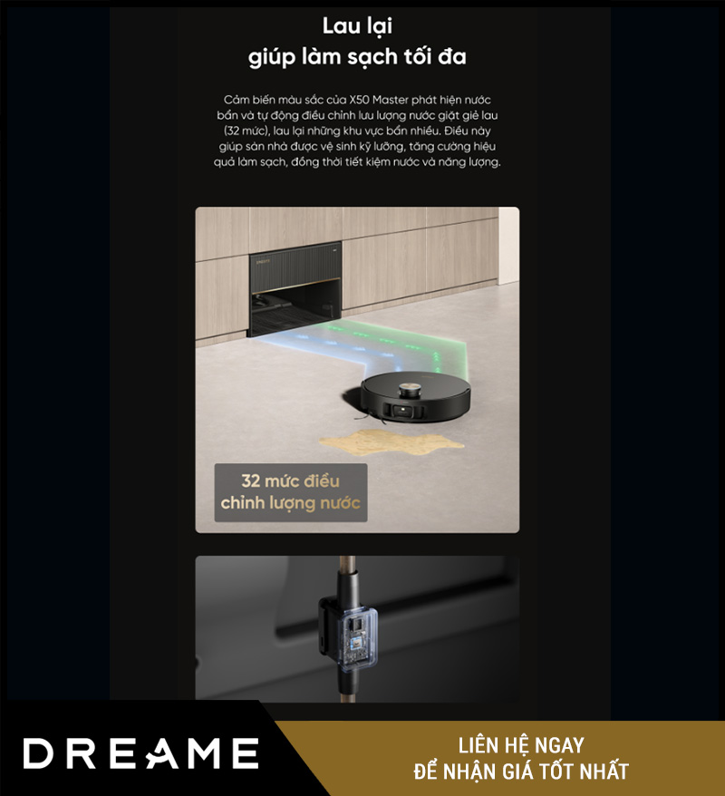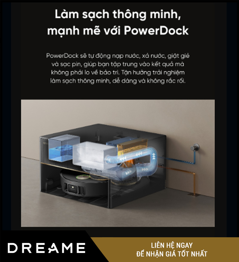 Tóm lại: Với PowerDock™, Dreame X50 Master giặt – sấy – hút rác – cấp nước hoàn toàn tự động, mang lại trải nghiệm lau dọn “rảnh tay” đúng nghĩa. Bạn chỉ cần chạm app một lần – mọi việc còn lại robot sẽ tự lo.