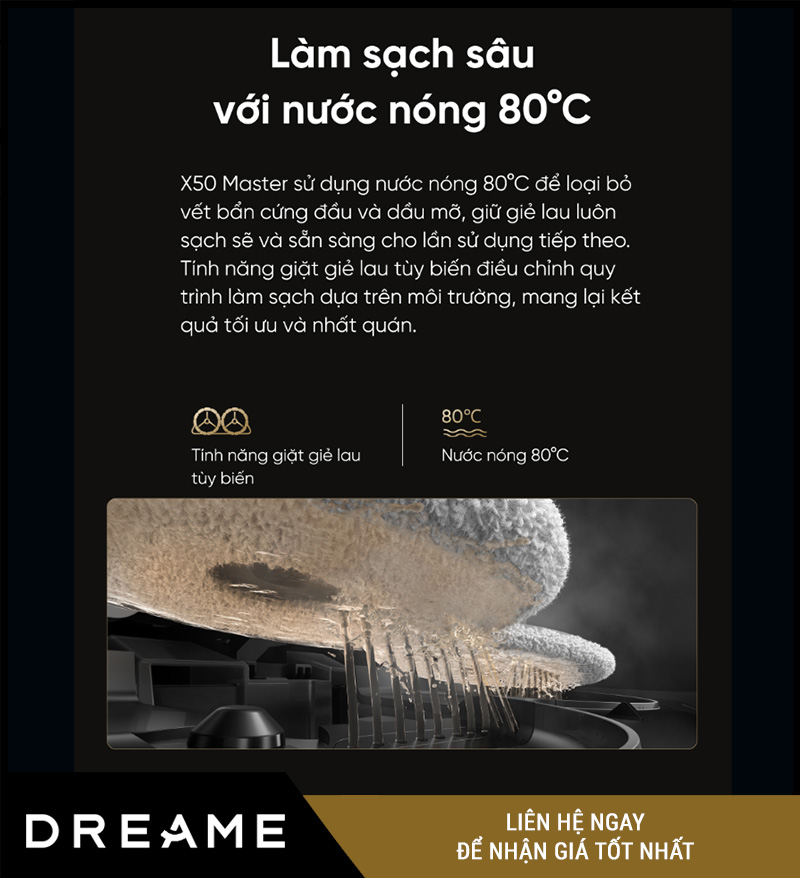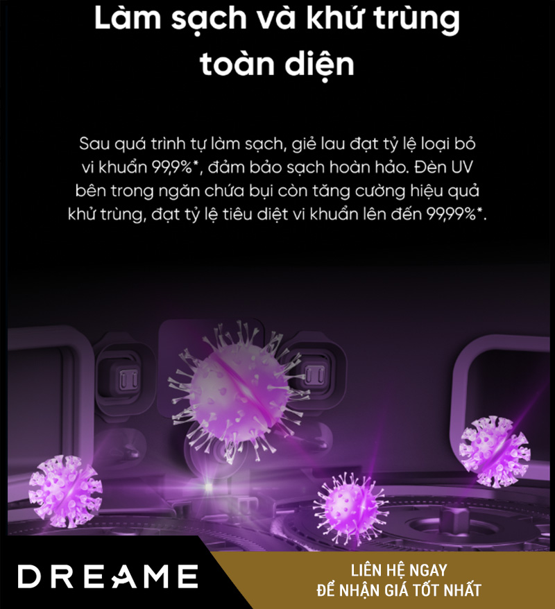 Không chỉ làm sạch sàn, Dreame X50 Master còn tự làm sạch chính mình – cụ thể là giặt giẻ lau bằng nước nóng lên đến 80°C, kết hợp đèn UV khử khuẩn, mang lại: