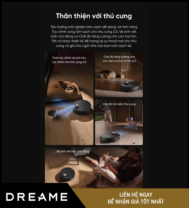 Dreame X50 Master không chỉ là robot dành cho con người – mà còn rất phù hợp với gia đình nuôi chó, mèo, nhờ những chế độ được tối ưu riêng: