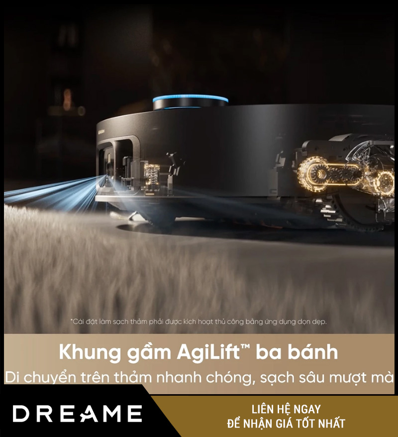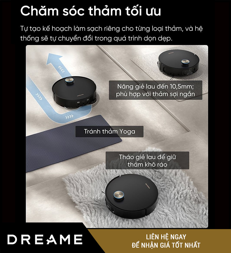 Hệ thống nâng/hạ tự điều chỉnh (nâng chổi, nâng giẻ…) giúp robot tách bạch tình huống cần hút khô và tình huống cần lau ướt, hạn chế việc kéo ẩm lên thảm hoặc làm bẩn chéo giữa các bề mặt.