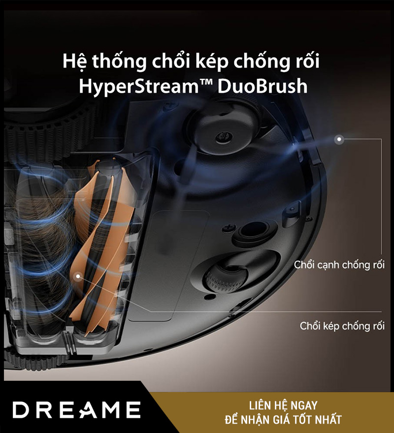 HyperStream™ DuoBrush là cụm 2 chổi chính thiết kế để giải quyết “nỗi đau” phổ biến nhất của robot: tóc dài/lông thú quấn chổi. Dreame mô tả chổi này có khả năng chống rối 100% (theo công bố) và xử lý tóc dài tới 30cm mà hạn chế cuốn rối, đồng thời tăng hiệu quả làm sạch so với chổi đơn.