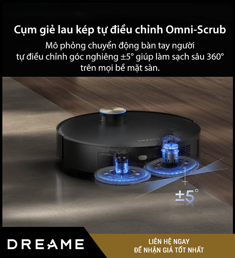 Omni-Scrub là cụm giẻ lau xoay kép được thiết kế để “chà” sàn chủ động hơn kiểu kéo giẻ thông thường. Điểm hay là giẻ có thể xoay 360° và tự điều chỉnh góc nghiêng ±5° để bám sát bề mặt sàn/khe gạch/sàn hơi gồ ghề.