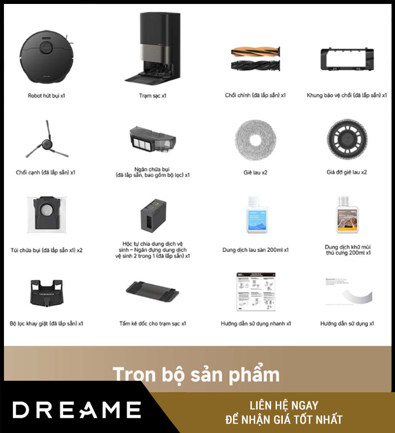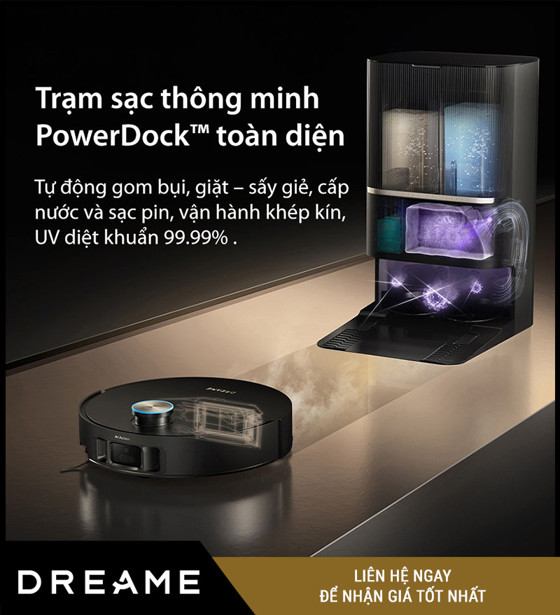 “Dock tự động toàn diện: đổ bụi – châm nước – giặt giẻ 100°C – sấy 50°C – tự vệ sinh khay giặt. Bạn chỉ việc để robot chạy.”