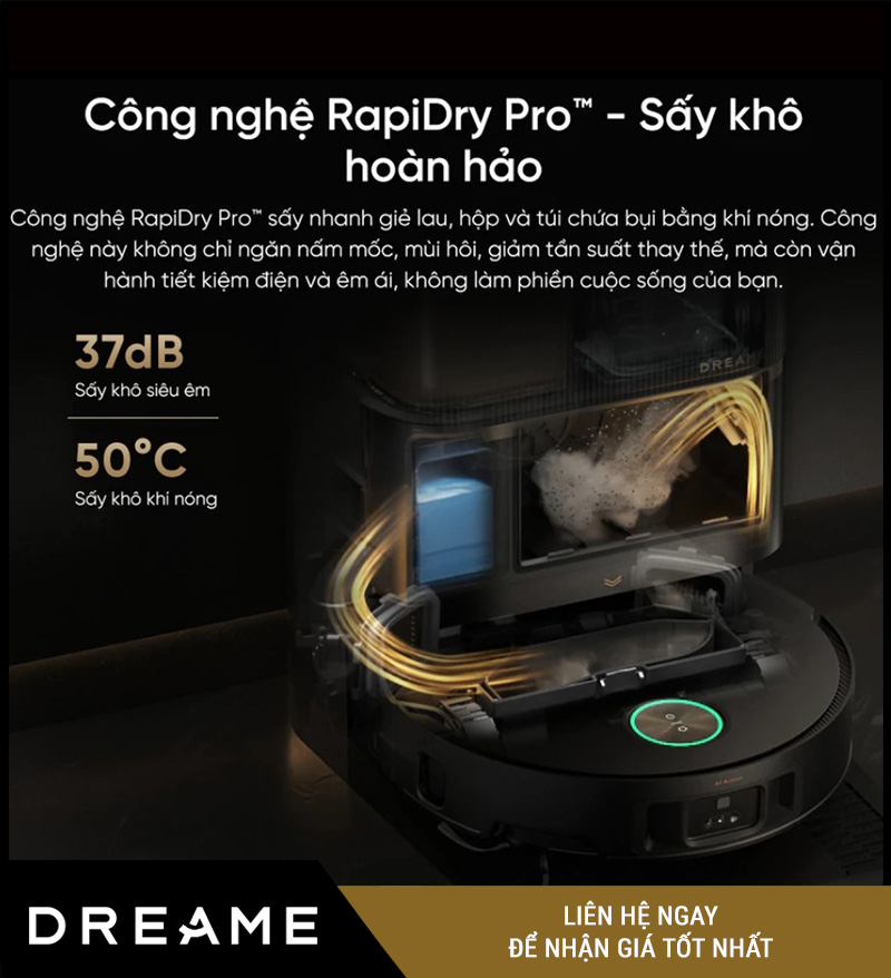 Sau khi giặt, RapiDry Pro™ dùng khí nóng 50°C để sấy giẻ nhanh, giải quyết vấn đề giẻ ẩm lâu → mùi ẩm/mốc (nhất là môi trường chung cư, mùa mưa).