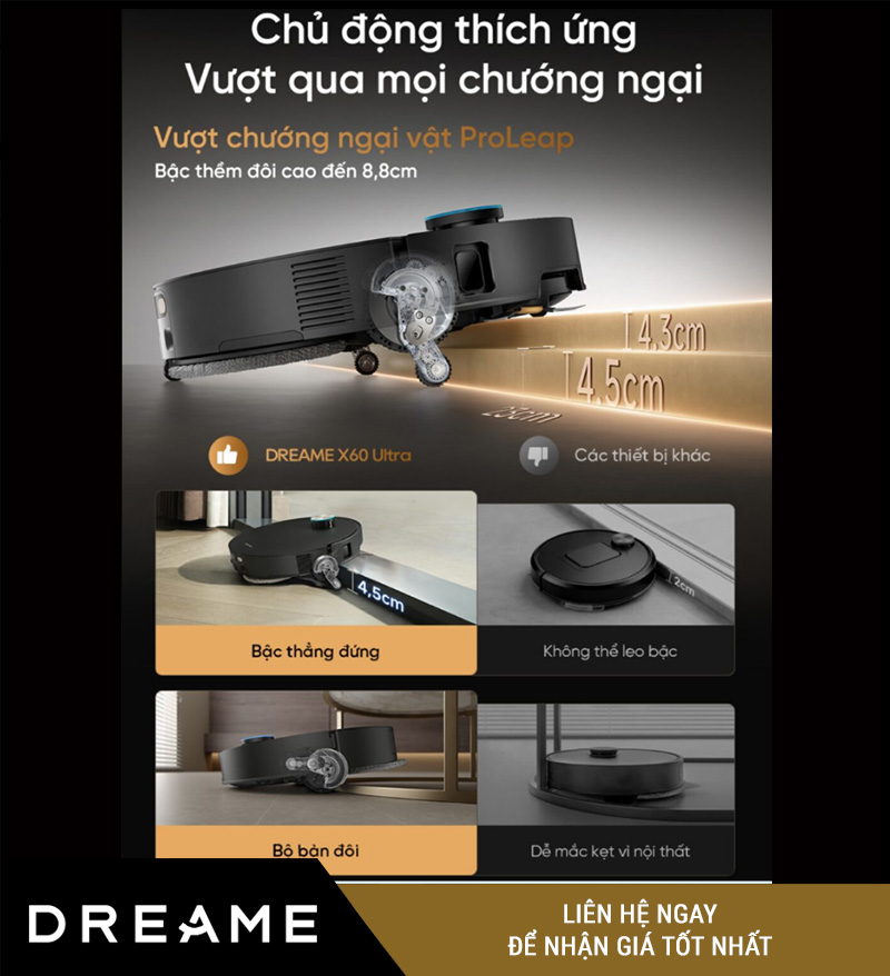 ProLeap™ là công nghệ giúp Dreame X60 Ultra có thể leo bậc cao lên tới 8cm, một thông số cực kỳ ấn tượng trong phân khúc robot hút bụi lau nhà cao cấp. Với khả năng này, robot dễ dàng vượt qua ngưỡng cửa, thanh trượt, thảm dày hoặc các bậc chênh nhỏ trong nhà.