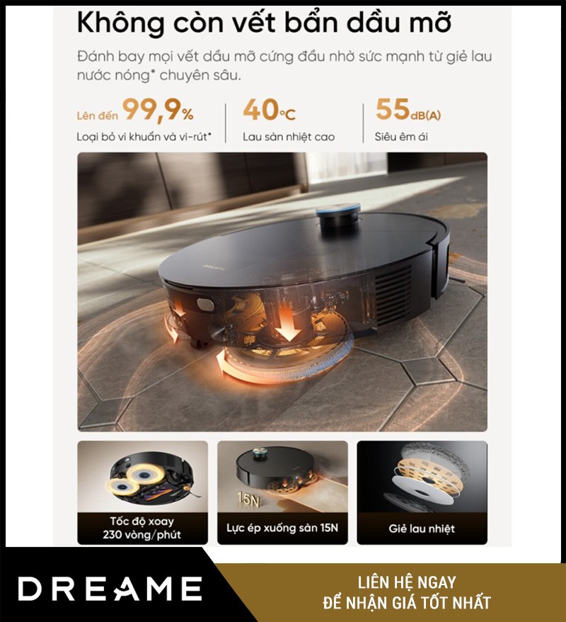 Hệ thống DreameGlide™ lau nước nóng 40°C, đánh bay vết bẩn dầu mỡ