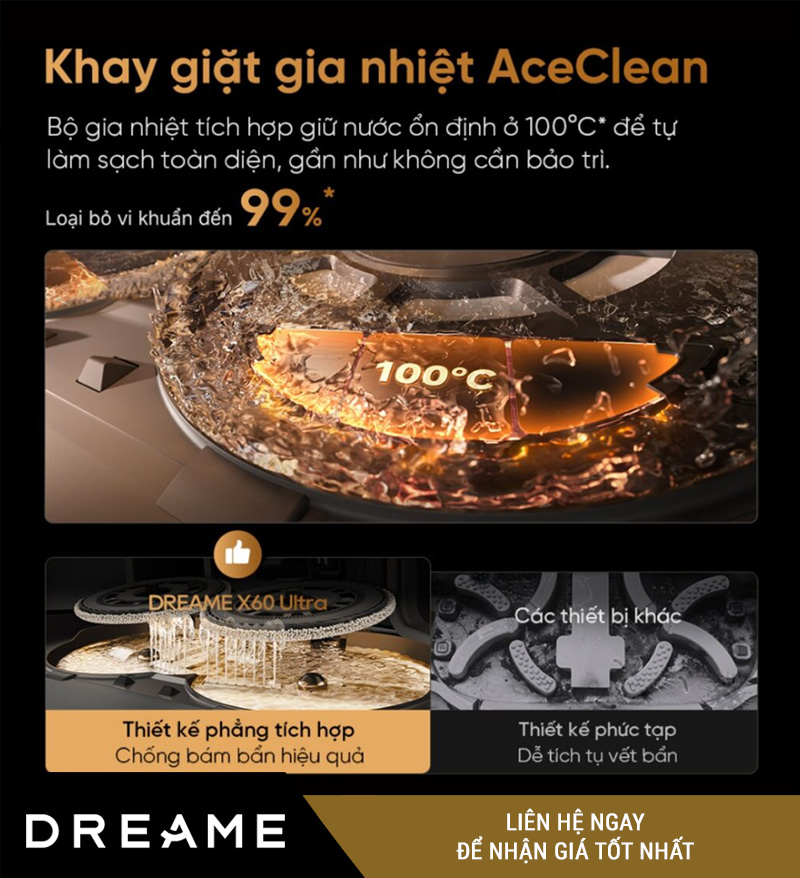 Một điểm cực kỳ cao cấp trên Robot hút bụi lau nhà Dreame X60 Ultra – Bản Quốc Tế là công nghệ ThermoHub™ tự giặt miếng lau bằng nước nóng 100°C. Đây là giải pháp giúp làm sạch miếng lau hiệu quả, hạn chế vi khuẩn, mùi hôi và cặn bẩn tích tụ sau nhiều lần sử dụng.
