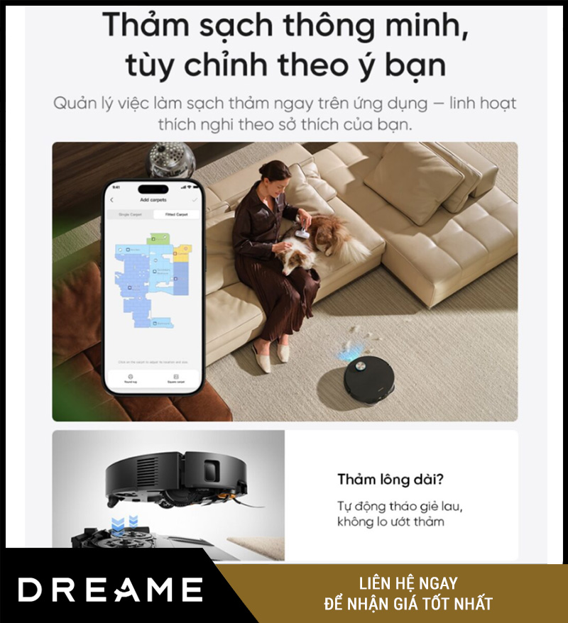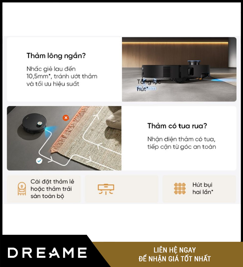 Với tính năng thảm thông minh, Dreame X60 Ultra có thể nhận diện khu vực thảm và tự động điều chỉnh chế độ làm sạch phù hợp. Robot có thể tăng lực hút khi đi lên thảm để hút sạch bụi bẩn sâu trong sợi thảm, đồng thời tối ưu chế độ lau nhằm hạn chế làm ướt bề mặt không phù hợp.