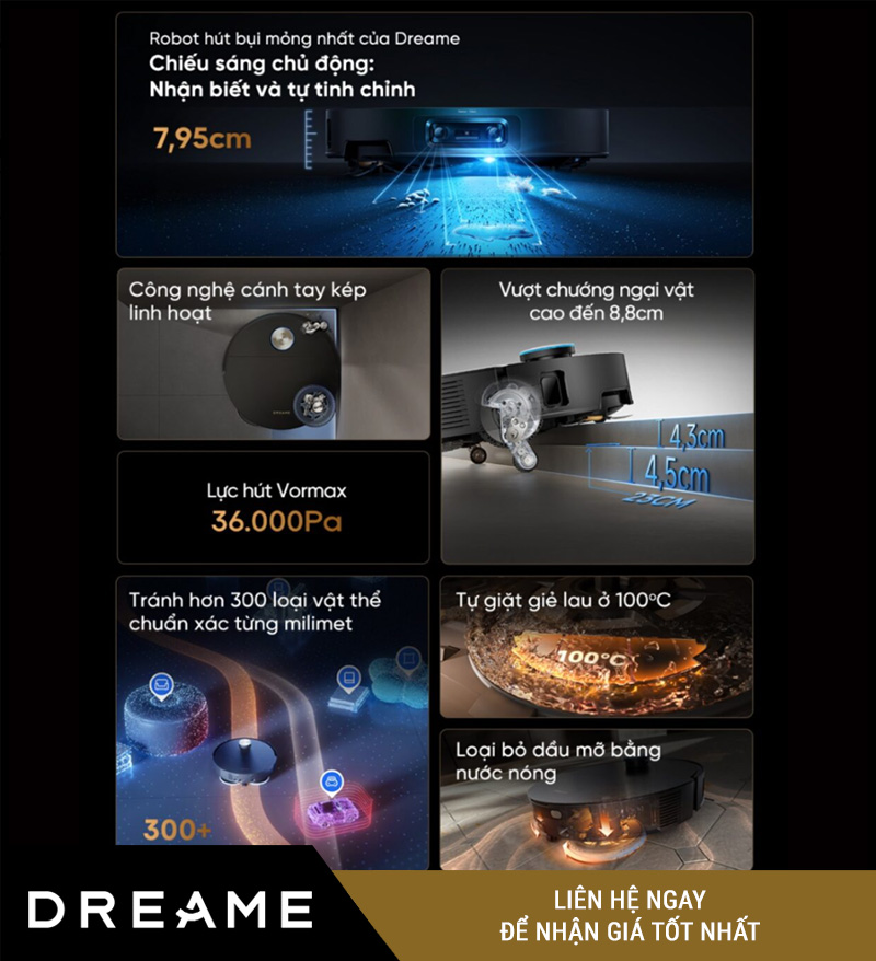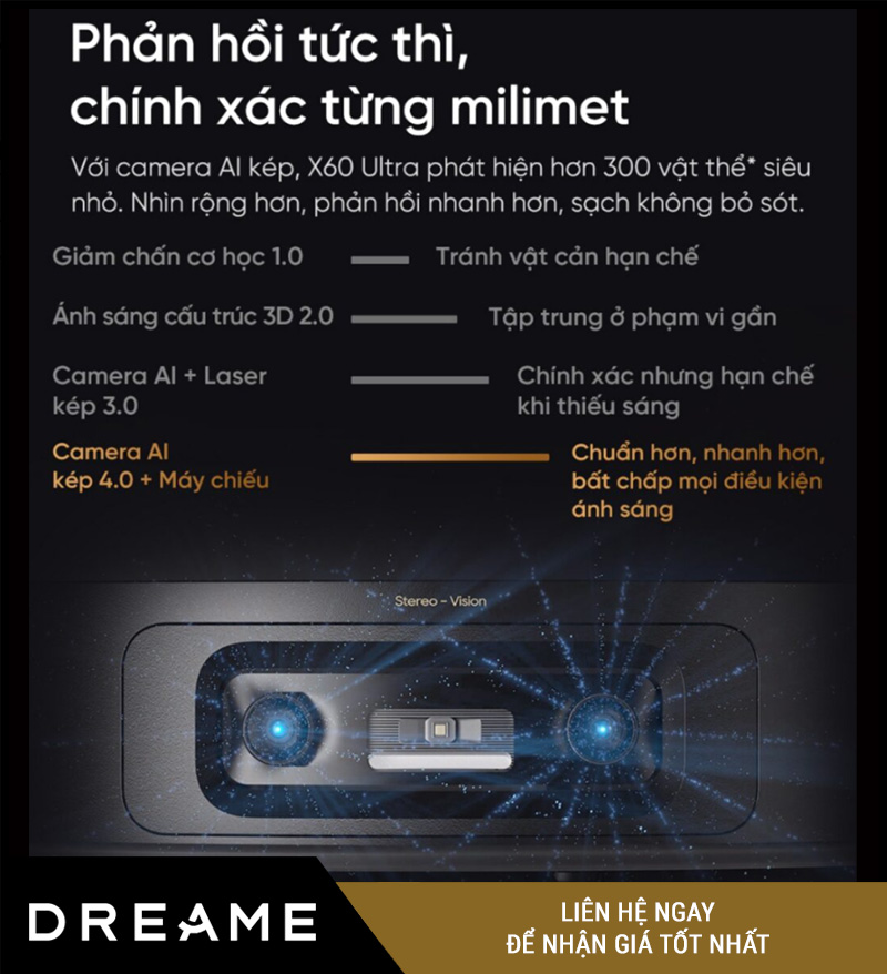 | Công nghệ tránh vật cản | AI Camera kép + Đèn LED + Cảm biến ánh sáng 3D Lateral |